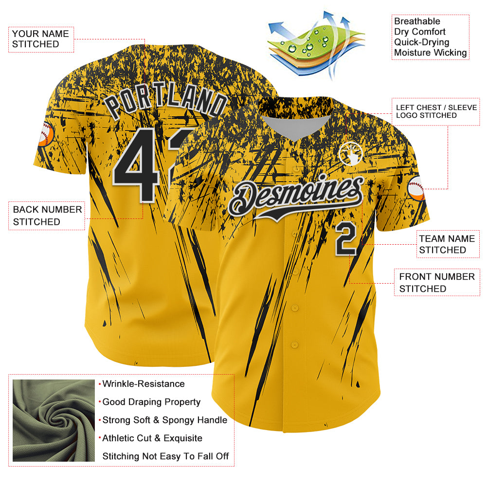 Custom Gold Black-White Distressed Scratch Brush Stroke Authentic Baseball Jersey