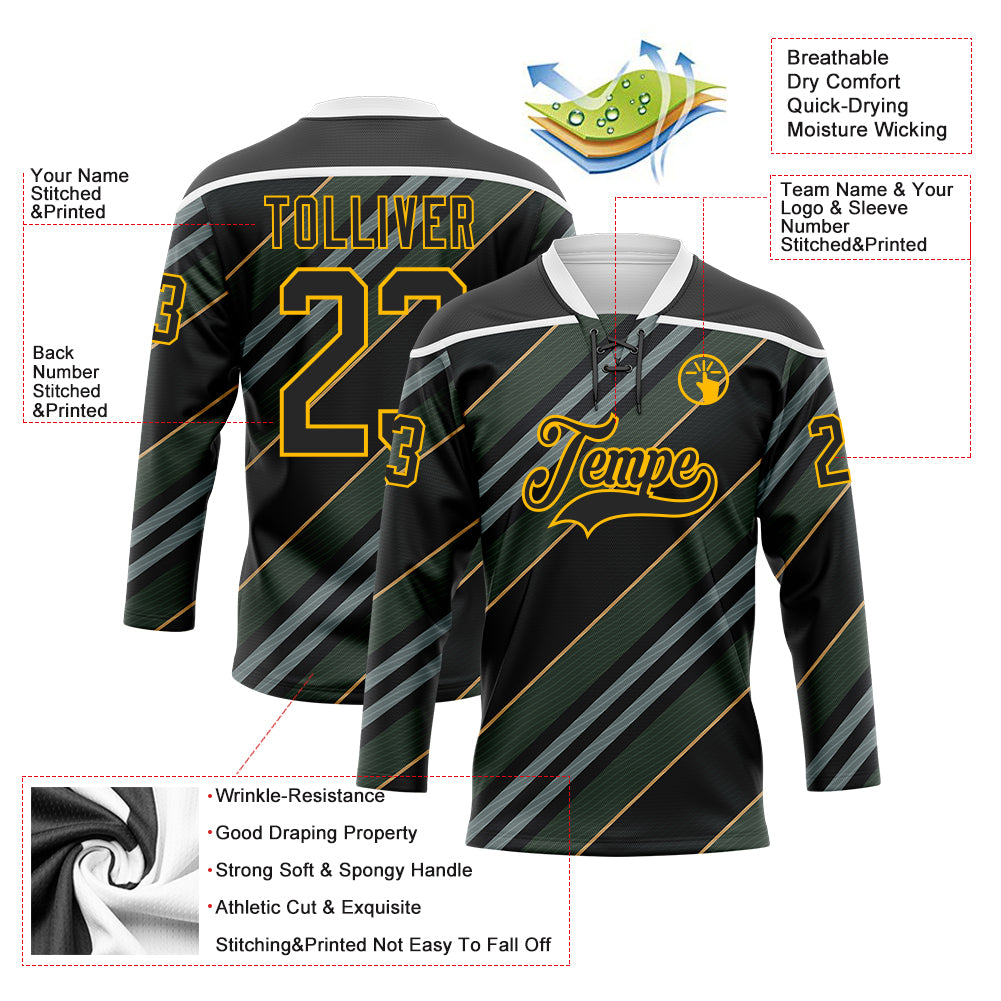 Custom Black Gold-White 3D Pattern Design Stripe Hockey Lace Neck Jersey