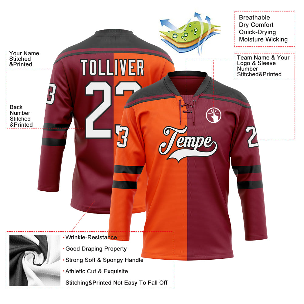 Custom Crimson White Orange-Black Split Fashion Hockey Lace Neck Jersey