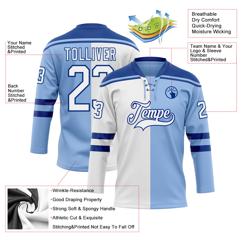 Custom Light Blue White-Royal Split Fashion Hockey Lace Neck Jersey