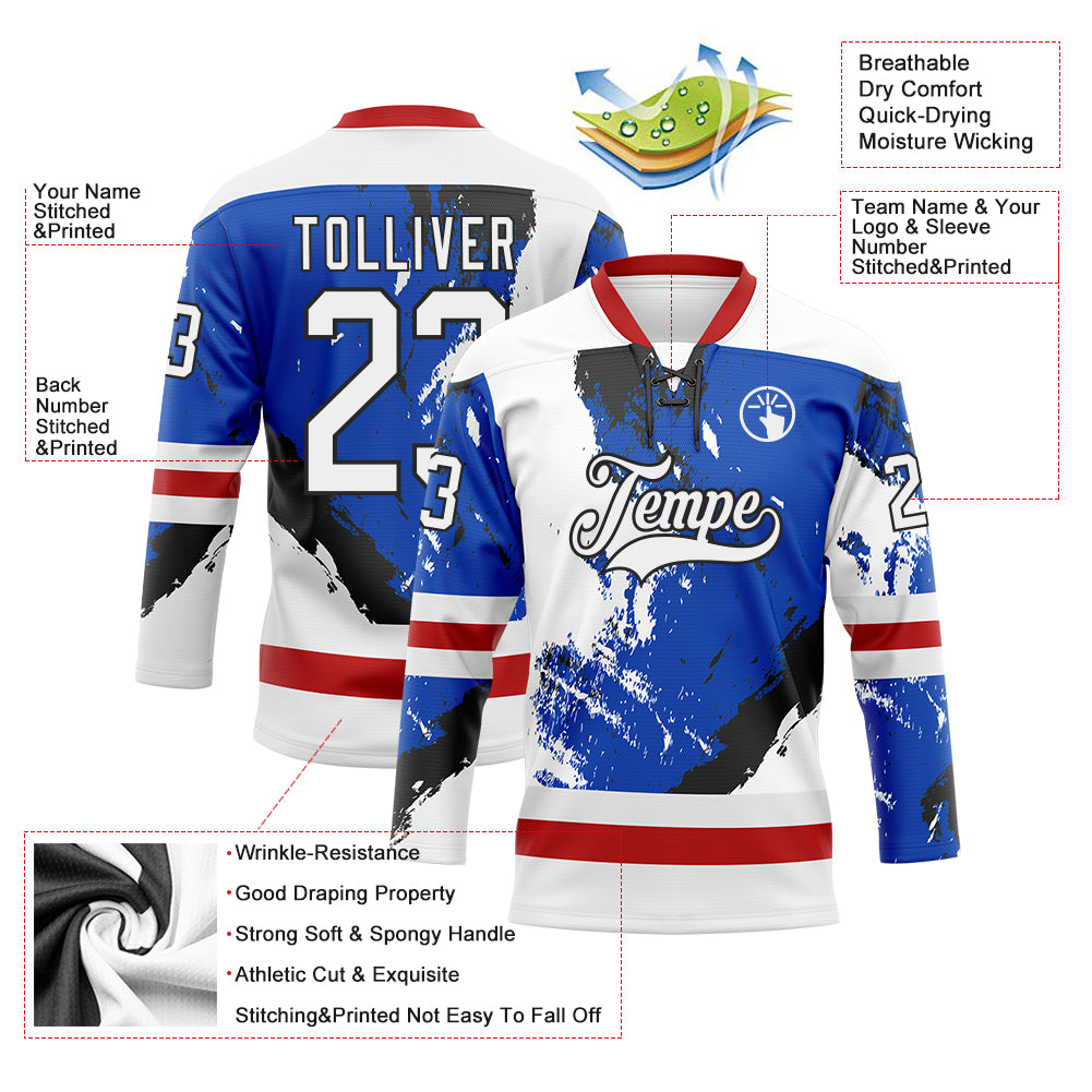 Custom White Thunder Blue Red-Black 3D Pattern Abstract Splatter Paint Hockey Lace Neck Jersey