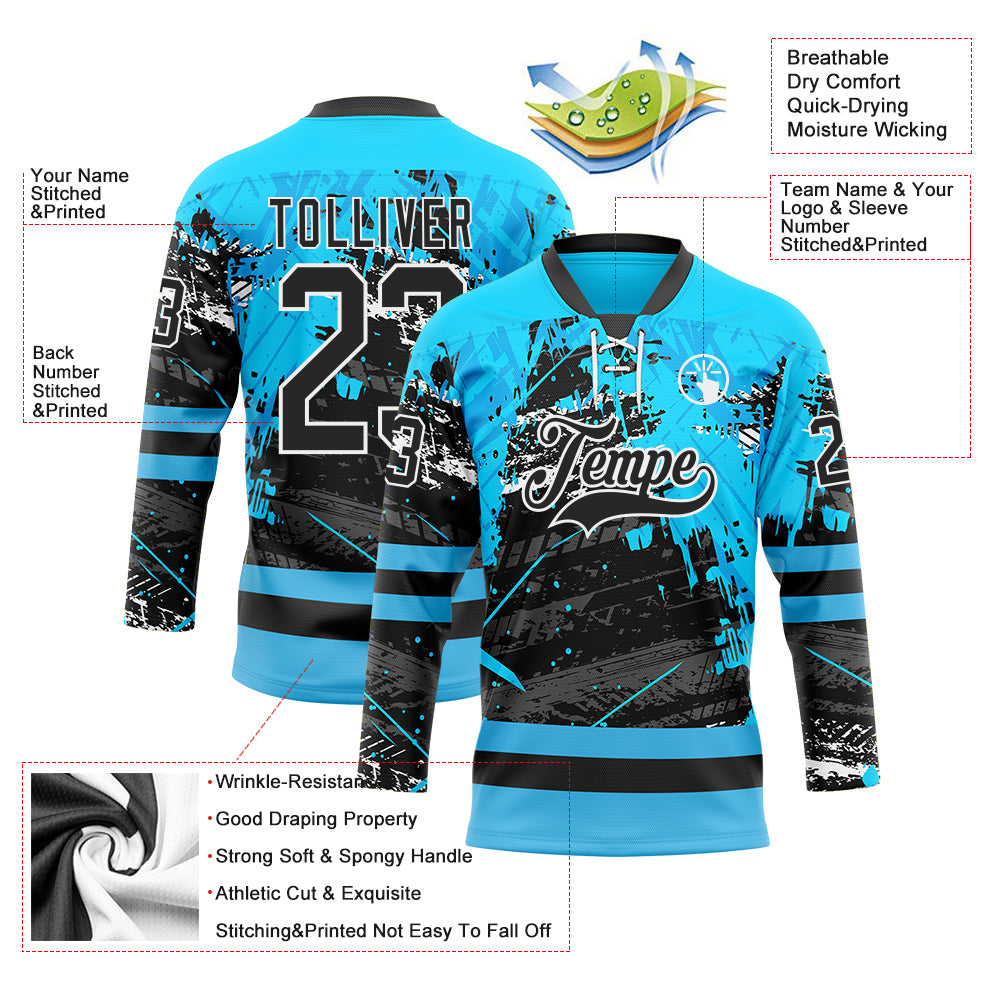 Custom Blue Black-White 3D Pattern Abstract Splatter Paint Grunge Hockey Lace Neck Jersey