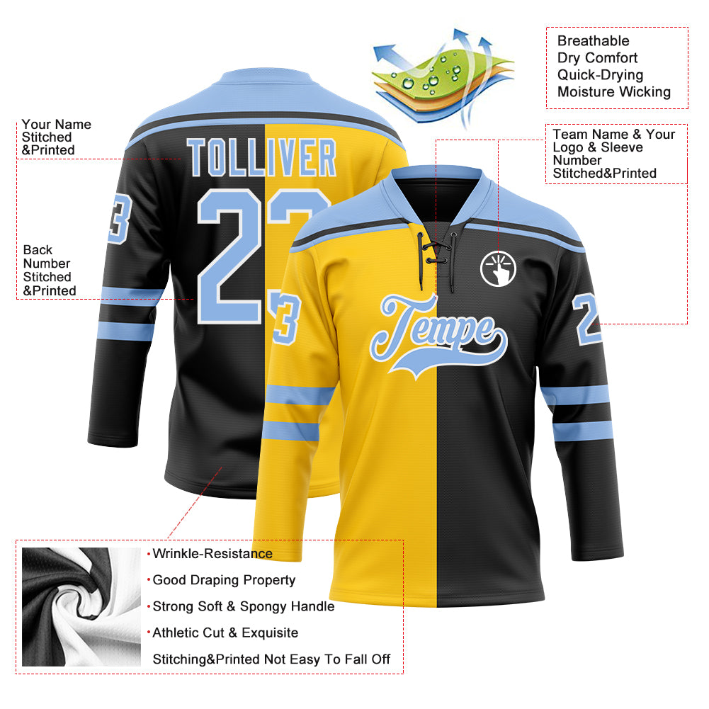Custom Black Light Blue Yellow-White Split Fashion Hockey Lace Neck Jersey