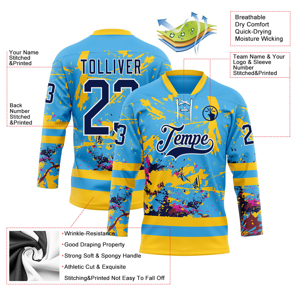 Custom Sky Blue Navy Yellow Red-White 3D Pattern Abstract Splatter Paint Hockey Lace Neck Jersey