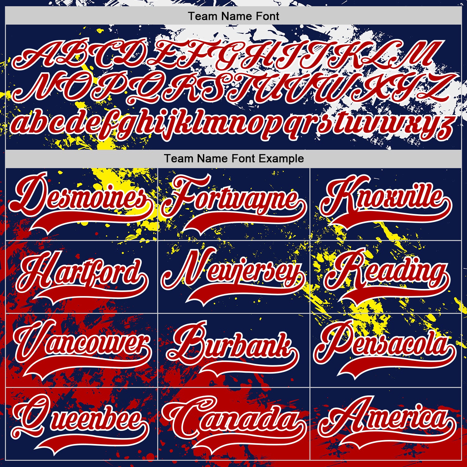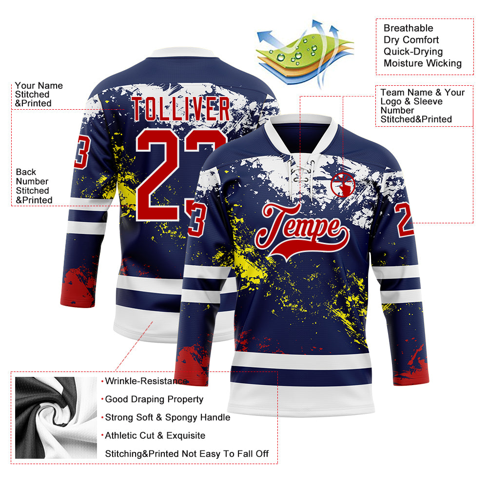 Custom Navy Red Yellow-White 3D Pattern Abstract Splatter Paint Hockey Lace Neck Jersey
