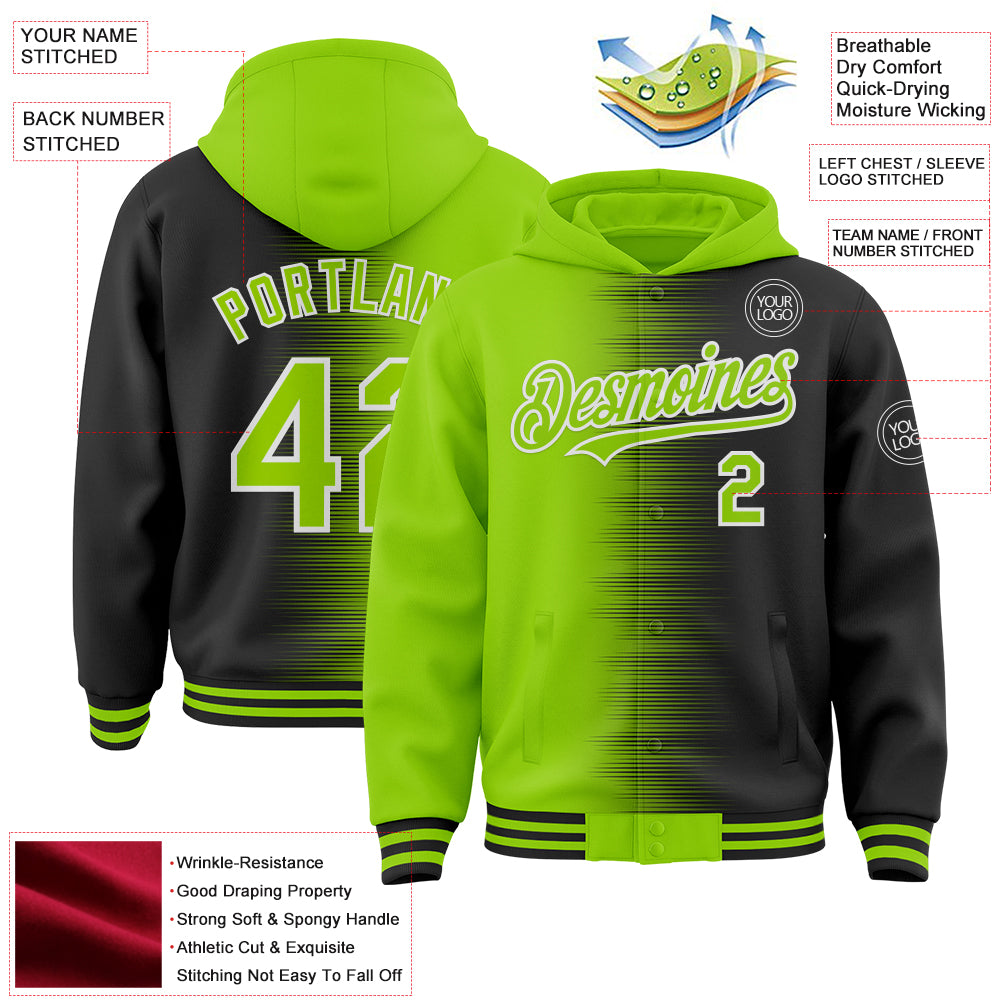Custom Neon Green Black-White Gradient Line Bomber Full-Snap Varsity Letterman Hoodie Jacket