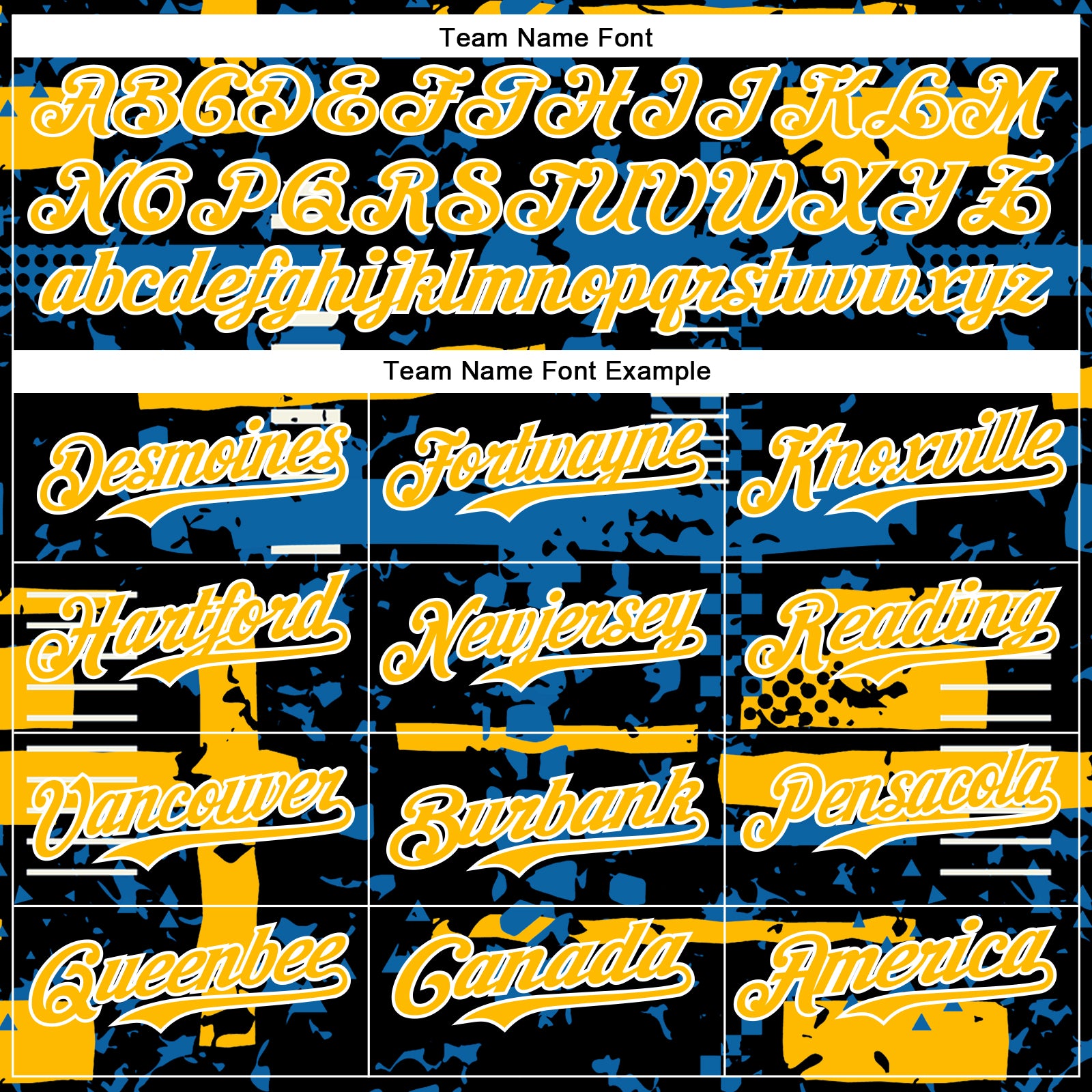 Custom Black Gold Blue-White Abstract Fragment Shape 3D Pattern Design Bomber Full-Snap Varsity Letterman Hoodie Jacket