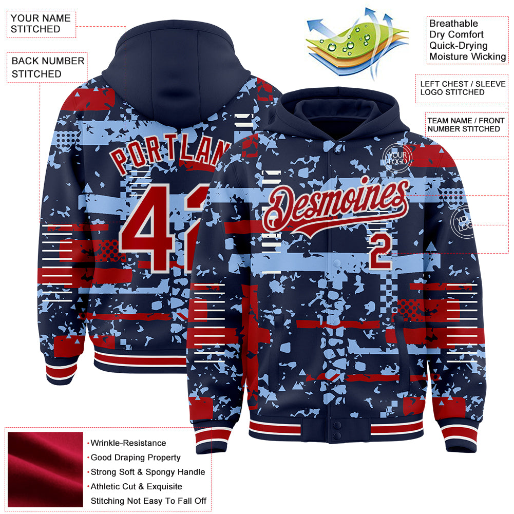 Custom Navy Red Light Blue-White Abstract Fragment Shape 3D Pattern Design Bomber Full-Snap Varsity Letterman Hoodie Jacket