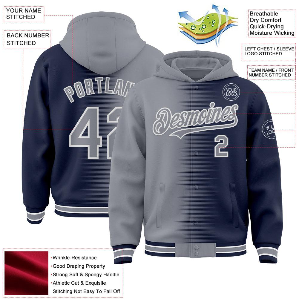 Custom Gray Navy-White Gradient Line Bomber Full-Snap Varsity Letterman Hoodie Jacket