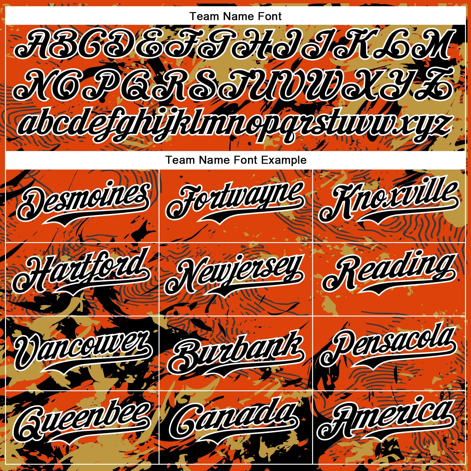 Custom Orange Black Old Gold-White Splash 3D Pattern Design Bomber Full-Snap Varsity Letterman Hoodie Jacket