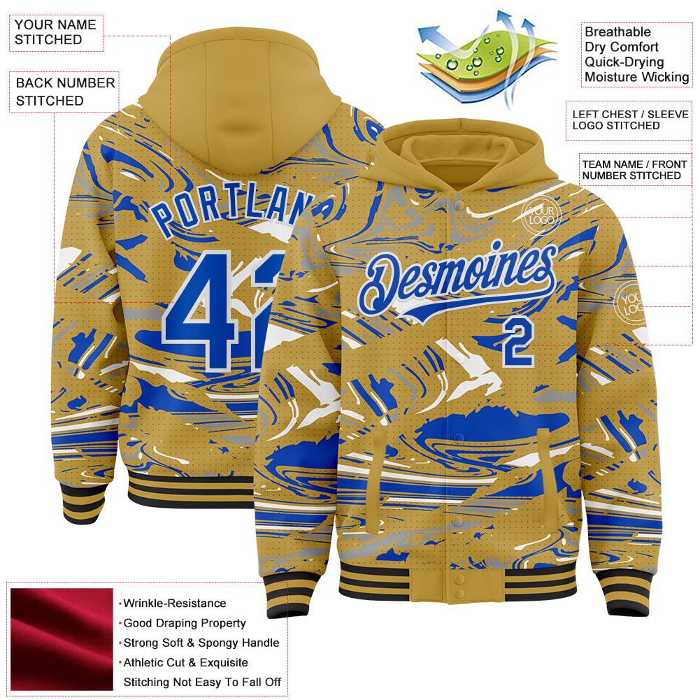 Custom Figure Thunder Blue Old Gold Black-White Fluid Bomber Full-Snap Varsity Letterman Hoodie Jacket