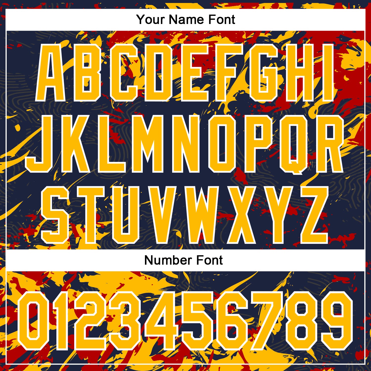 Custom Navy Gold Red-White Splash 3D Pattern Design Bomber Full-Snap Varsity Letterman Hoodie Jacket