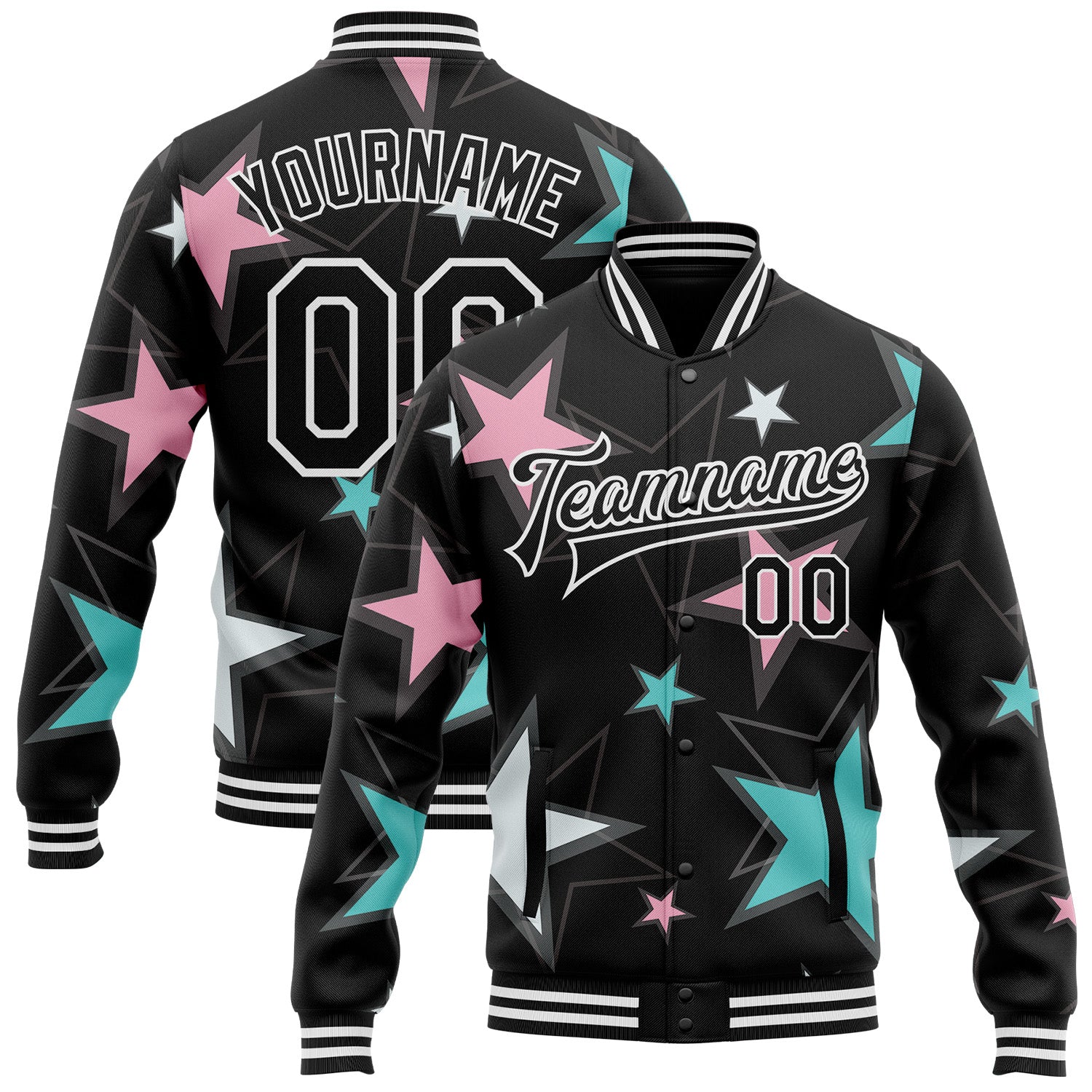 Custom Black White Y2K Stars 3D Pattern Design Bomber Full-Snap Varsity Letterman Jacket