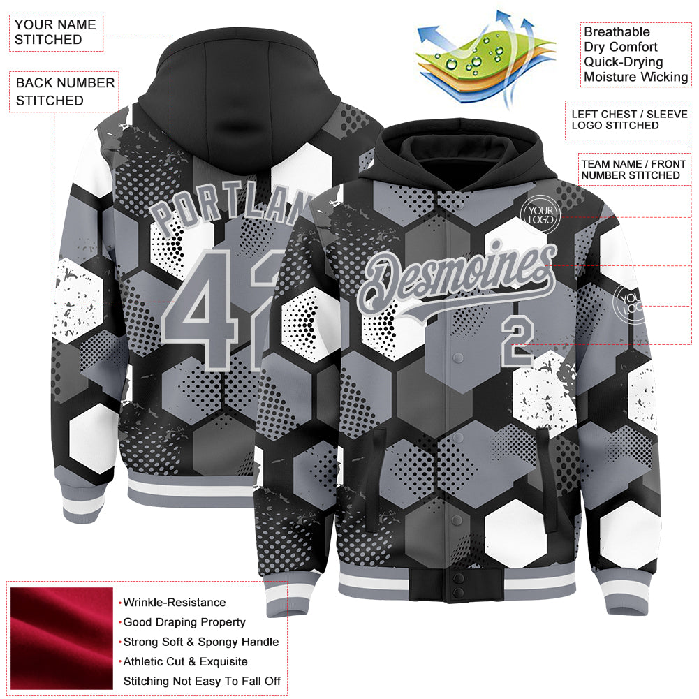 Custom Black Gray-White Geometric Shape 3D Pattern Design Bomber Full-Snap Varsity Letterman Hoodie Jacket