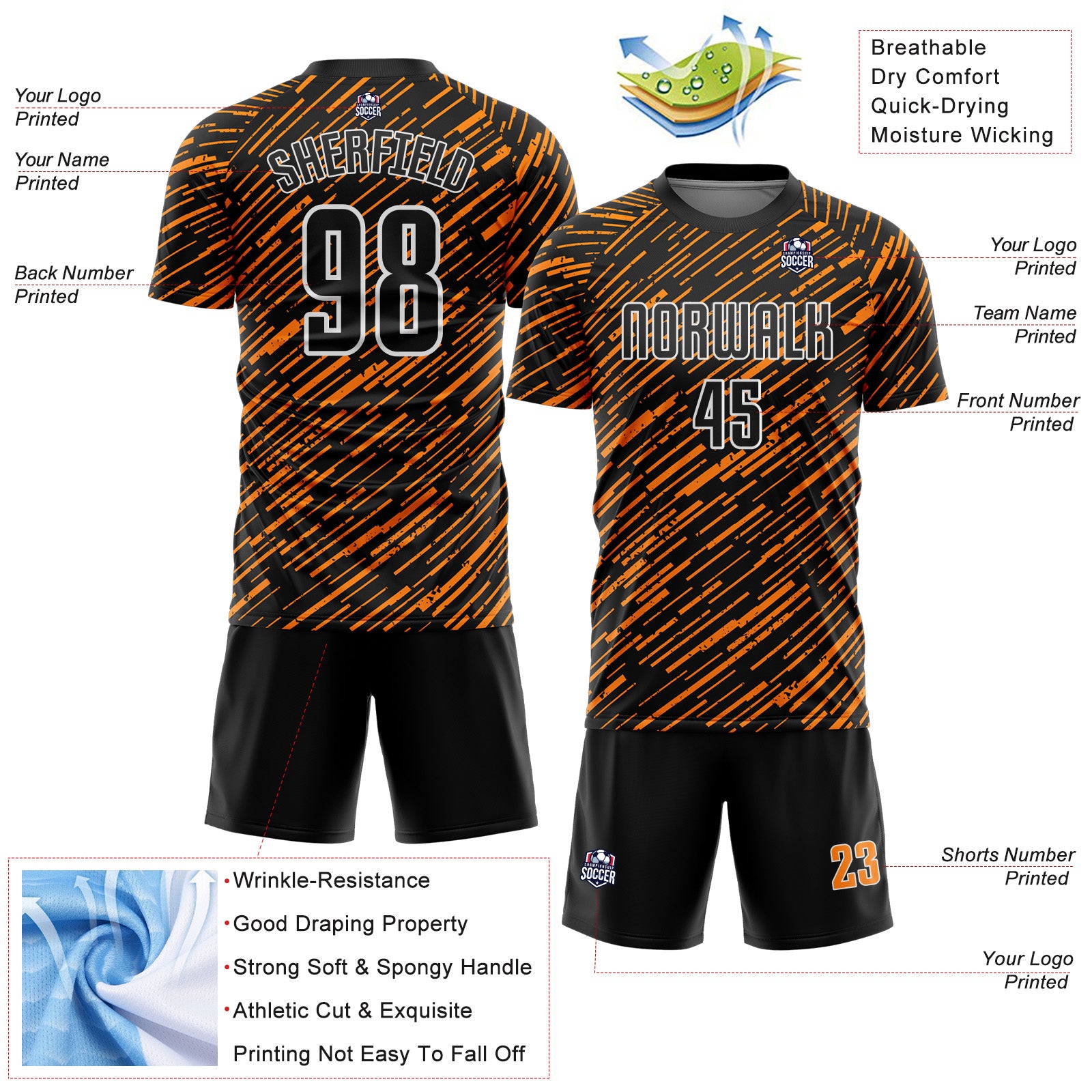 Custom Black Bay Orange-White Line Sports Sublimation Soccer Uniform Jersey