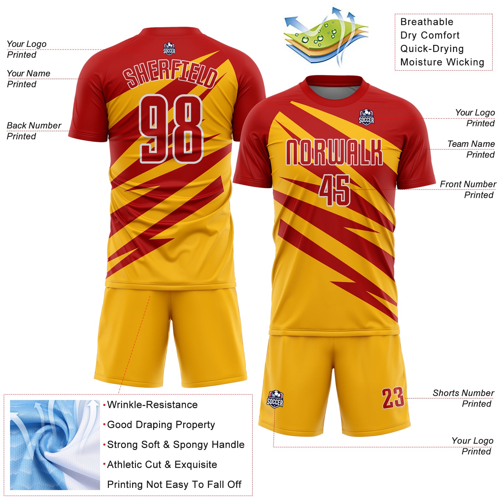 Custom Red Gold-White Abstract Line Sports Sublimation Soccer Uniform Jersey