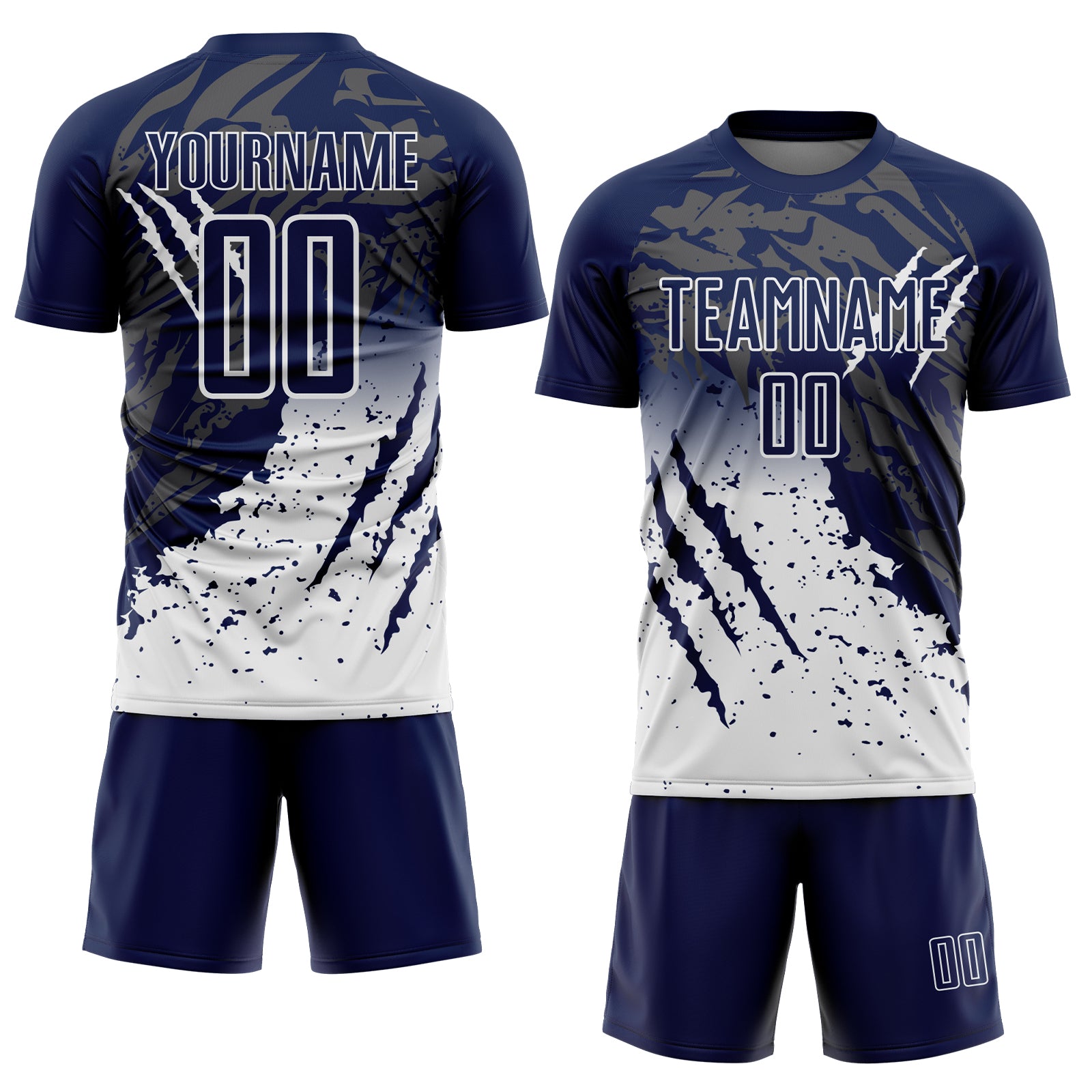 Custom Navy White Gradient Claw Mark Splatter Sports Sublimation Soccer Uniform Jersey