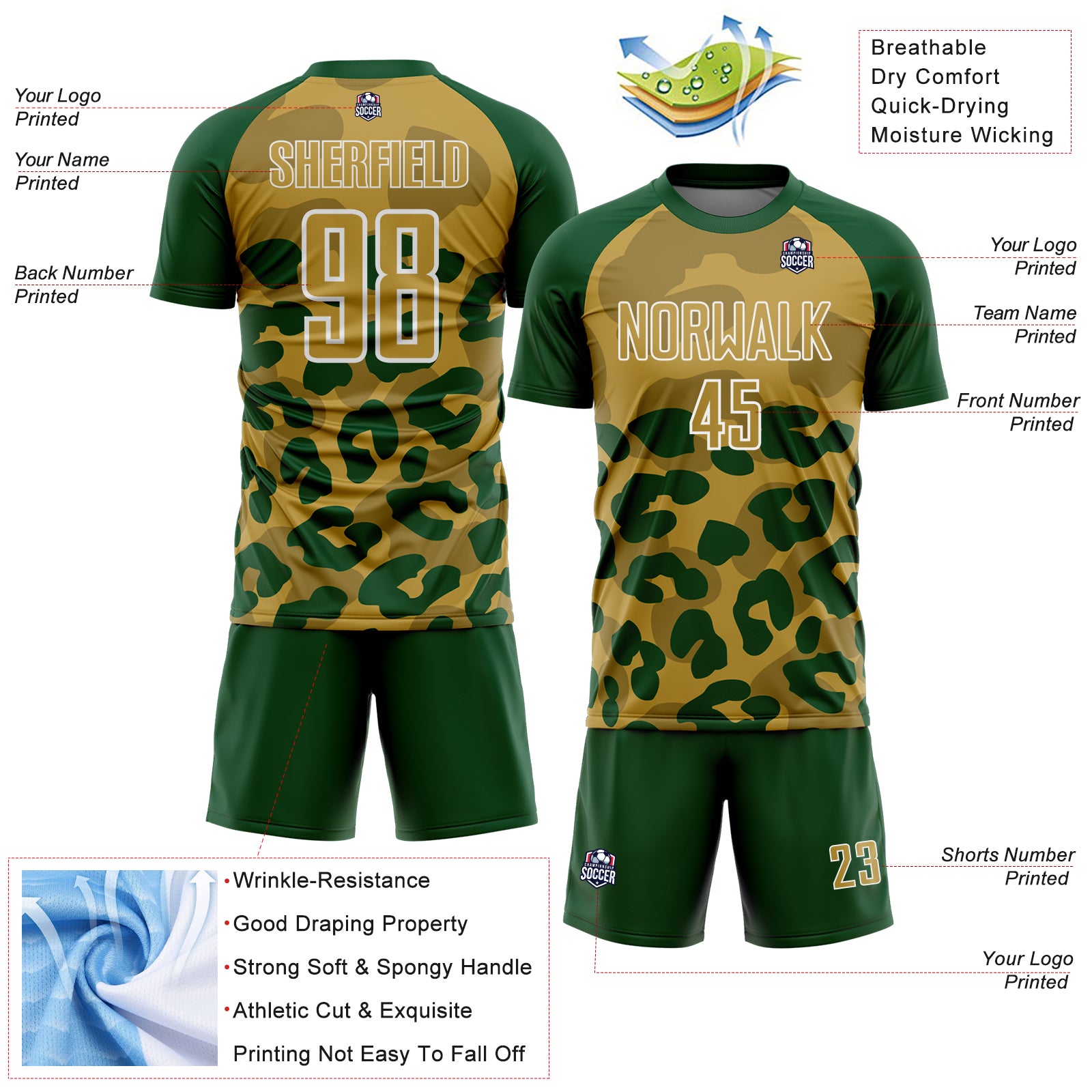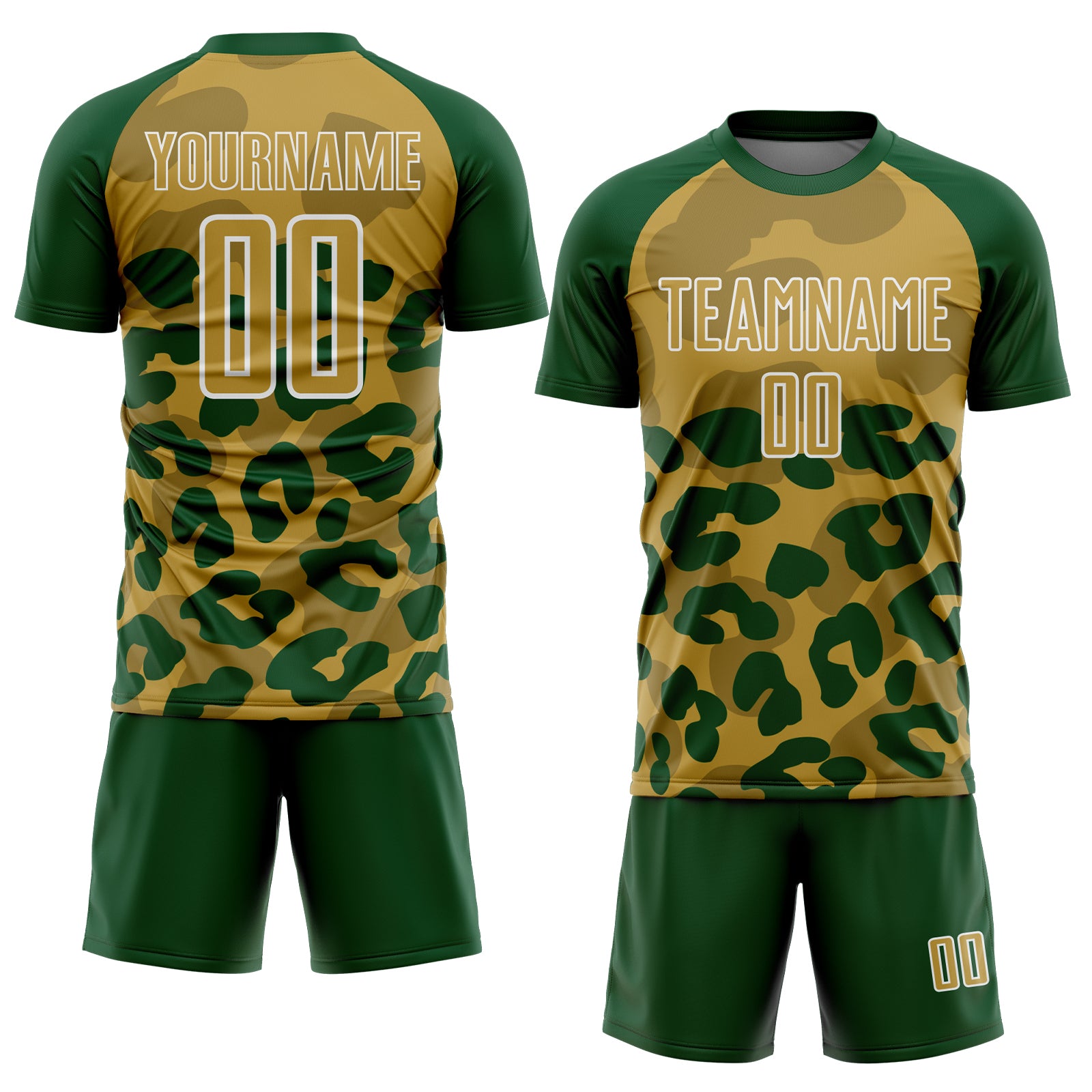 Custom Green Old Gold-White Animal Leopard Print Sports Sublimation Soccer Uniform Jersey