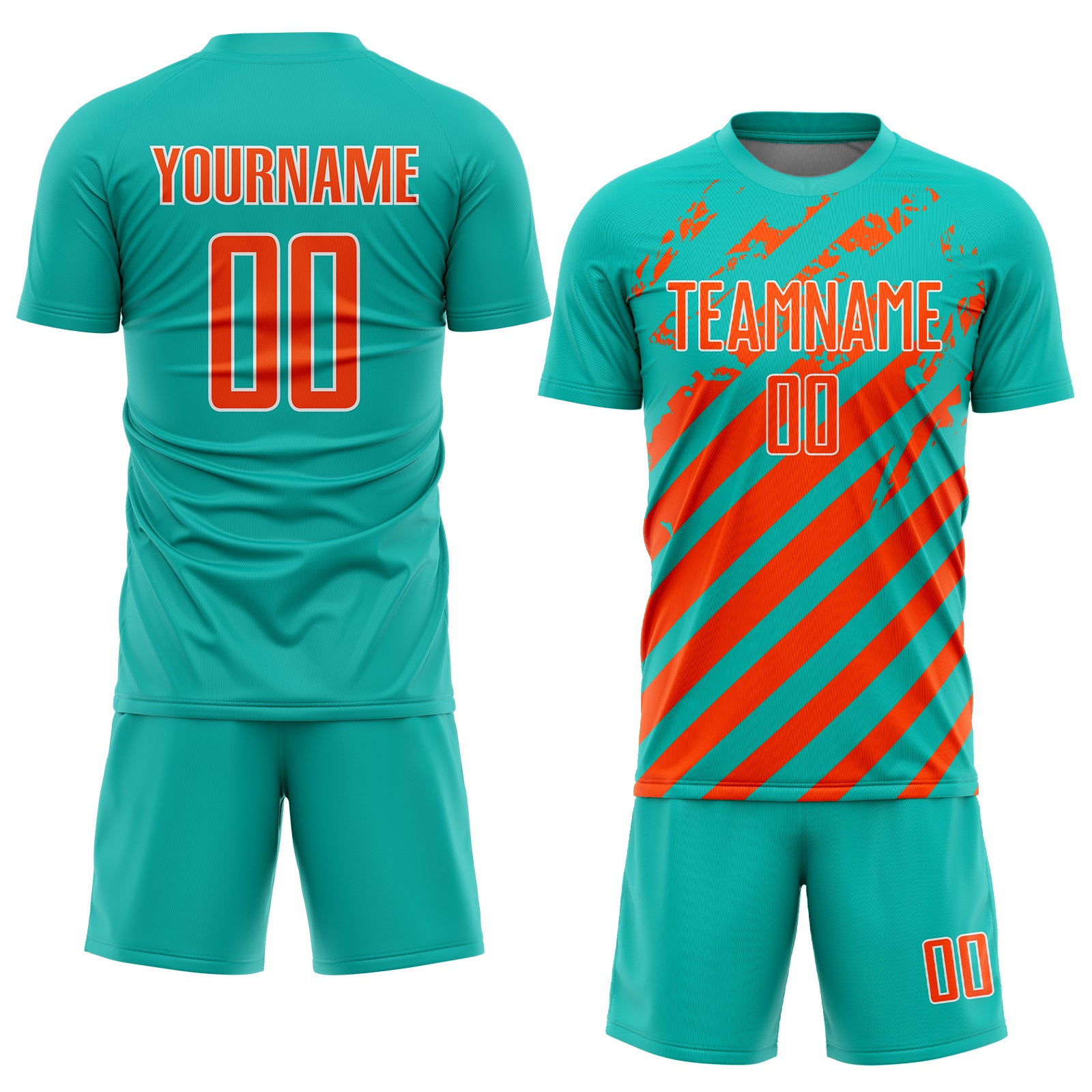 Custom Aqua Orange-White Distressed Diagonal Stripe Pattern Sports Sublimation Soccer Uniform Jersey