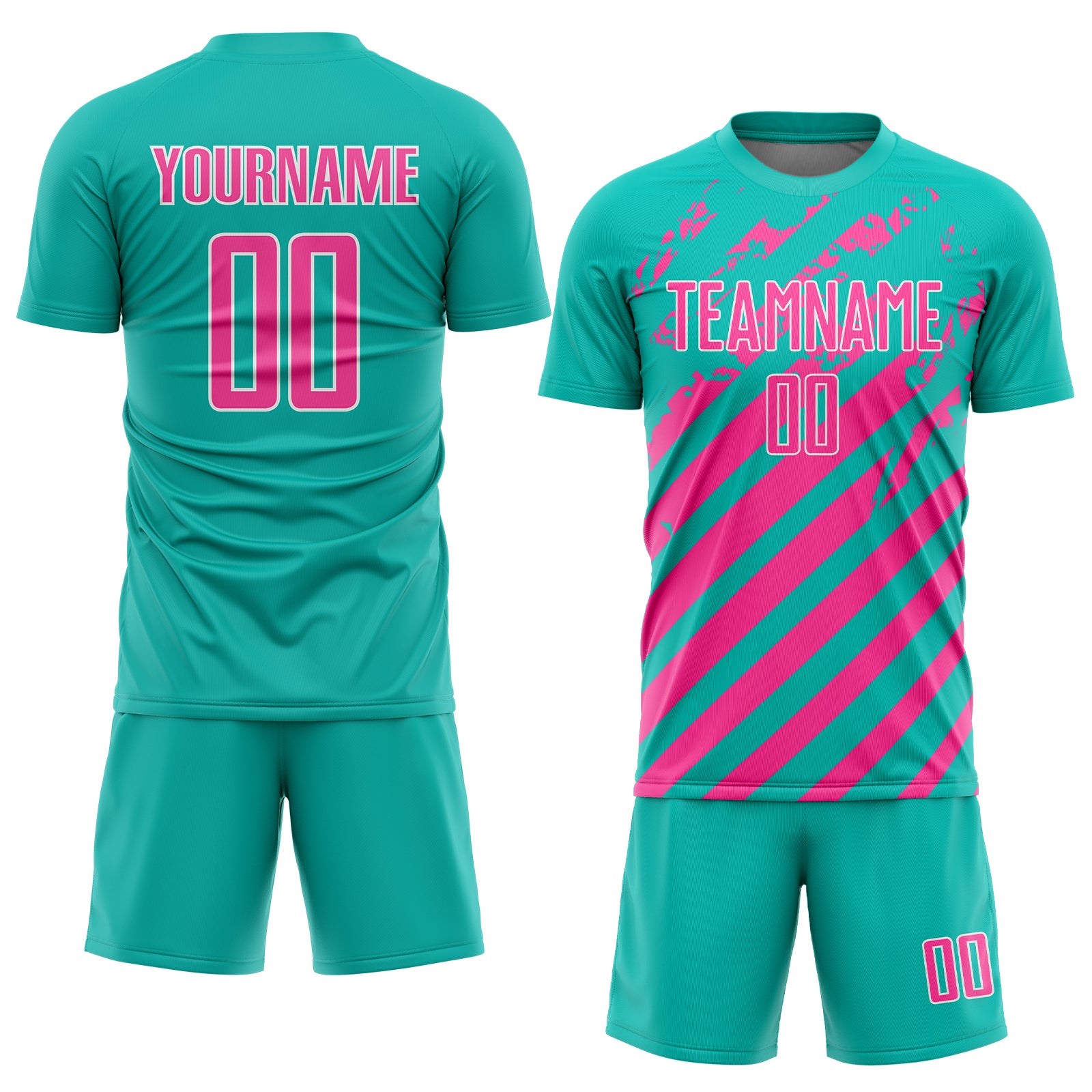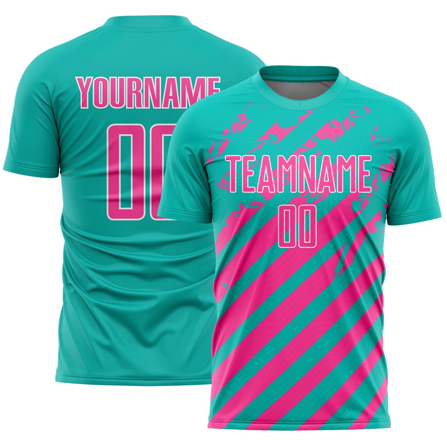 Custom Aqua Pink-White Distressed Diagonal Stripe Pattern Sports Sublimation Soccer Uniform Jersey