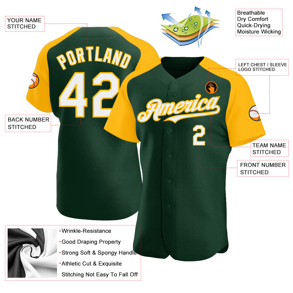 Custom Green White-Gold Authentic Raglan Sleeves Baseball Jersey