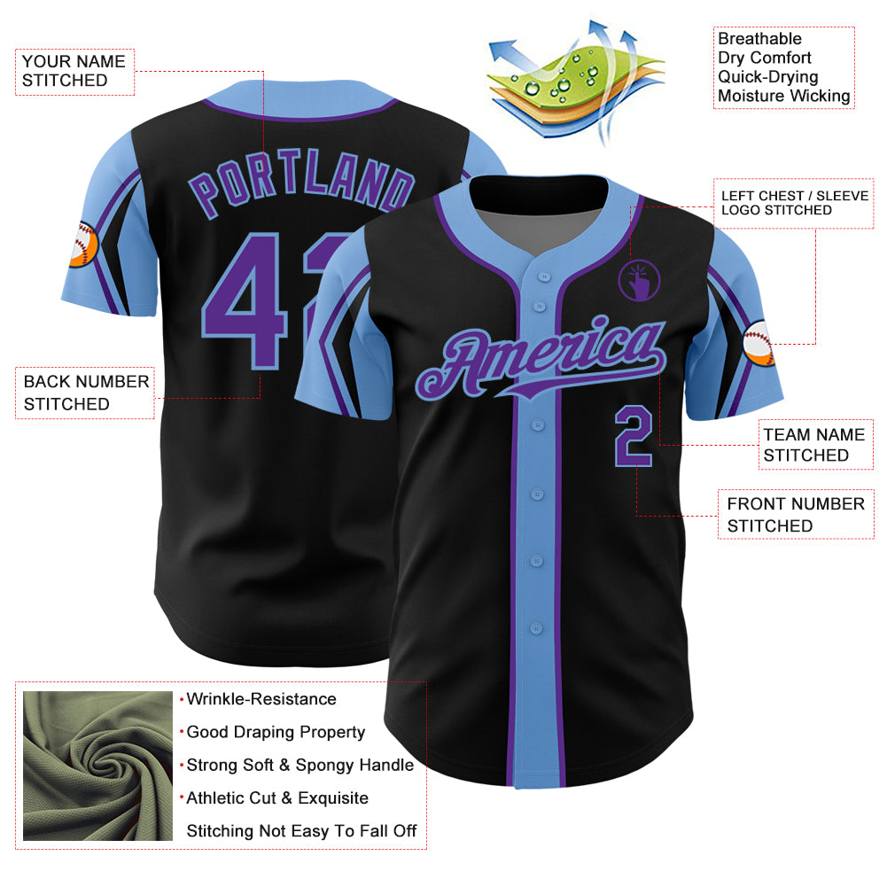 Custom Black Purple-Light Blue 3 Colors Arm Shapes Authentic Baseball Jersey