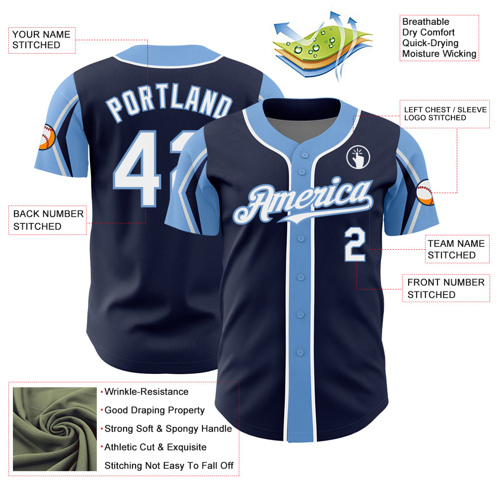 Custom Navy White-Light Blue 3 Colors Arm Shapes Authentic Baseball Jersey