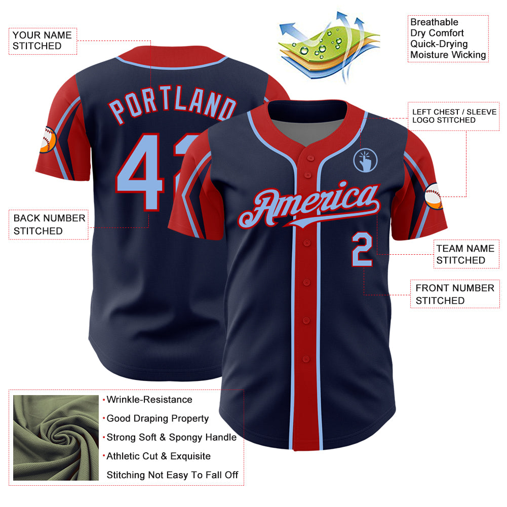 Custom Navy Light Blue-Red 3 Colors Arm Shapes Authentic Baseball Jersey