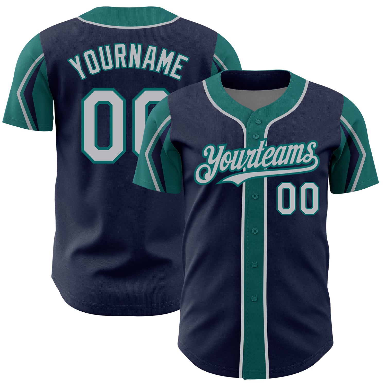 Custom Navy Gray-Teal 3 Colors Arm Shapes Authentic Baseball Jersey
