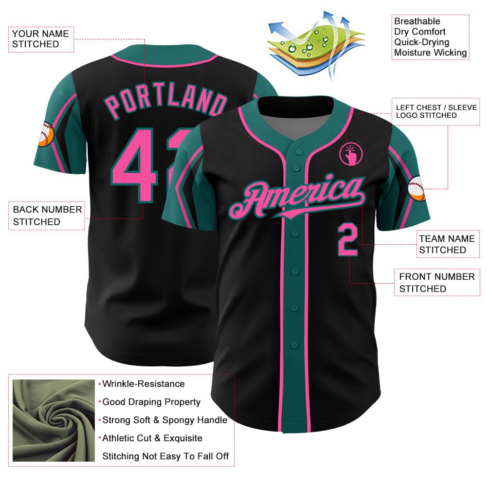Custom Black Pink-Teal 3 Colors Arm Shapes Authentic Baseball Jersey
