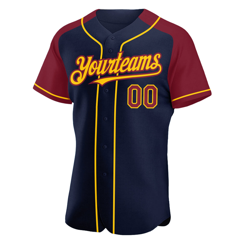 Custom Navy Crimson-Yellow Authentic Raglan Sleeves Baseball Jersey