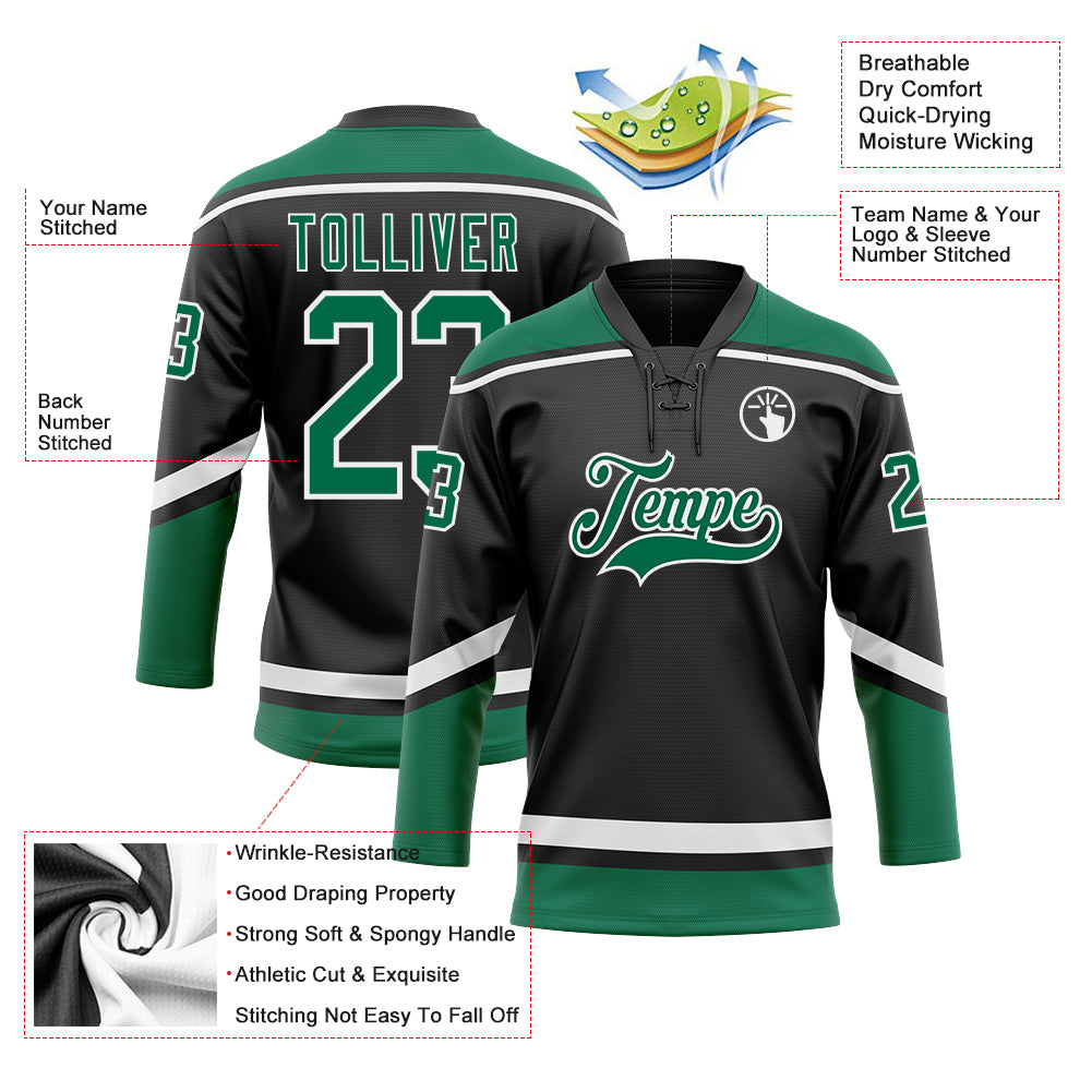 Custom Black White-Kelly Green Hockey Lace Neck Jersey