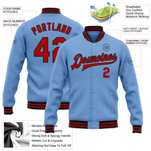 • Load image into Gallery viewer, Custom Light Blue Red-Black Bomber Full-Snap Varsity Letterman Jacket