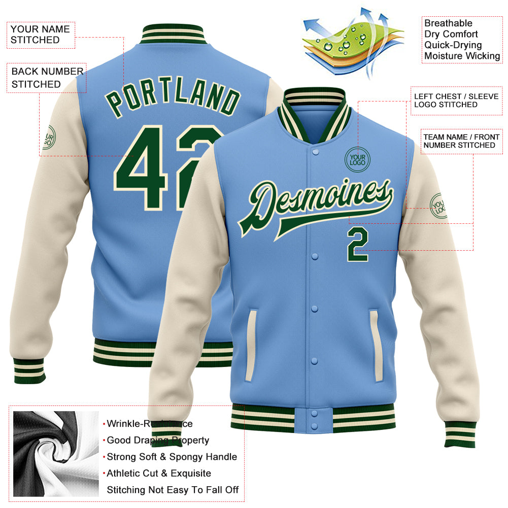Custom Light Blue Green-Cream Bomber Full-Snap Varsity Letterman Two Tone Jacket