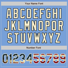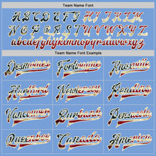 • Load image into Gallery viewer, Custom Light Blue Vintage USA Flag Cream-Black Bomber Full-Snap Varsity Letterman Jacket