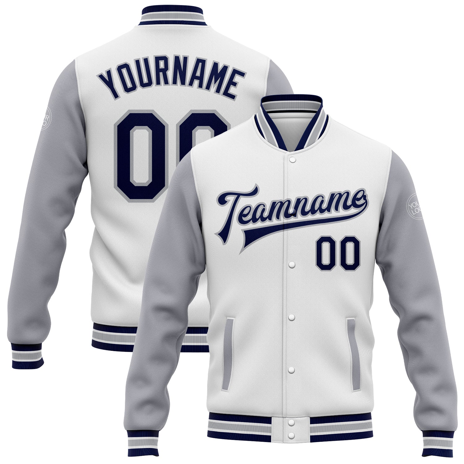 Custom White Navy-Gray Bomber Full-Snap Varsity Letterman Two Tone Jacket
