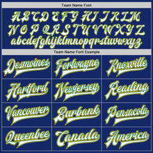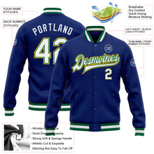 • Load image into Gallery viewer, Custom Royal White Kelly Green-Gold Bomber Full-Snap Varsity Letterman Jacket