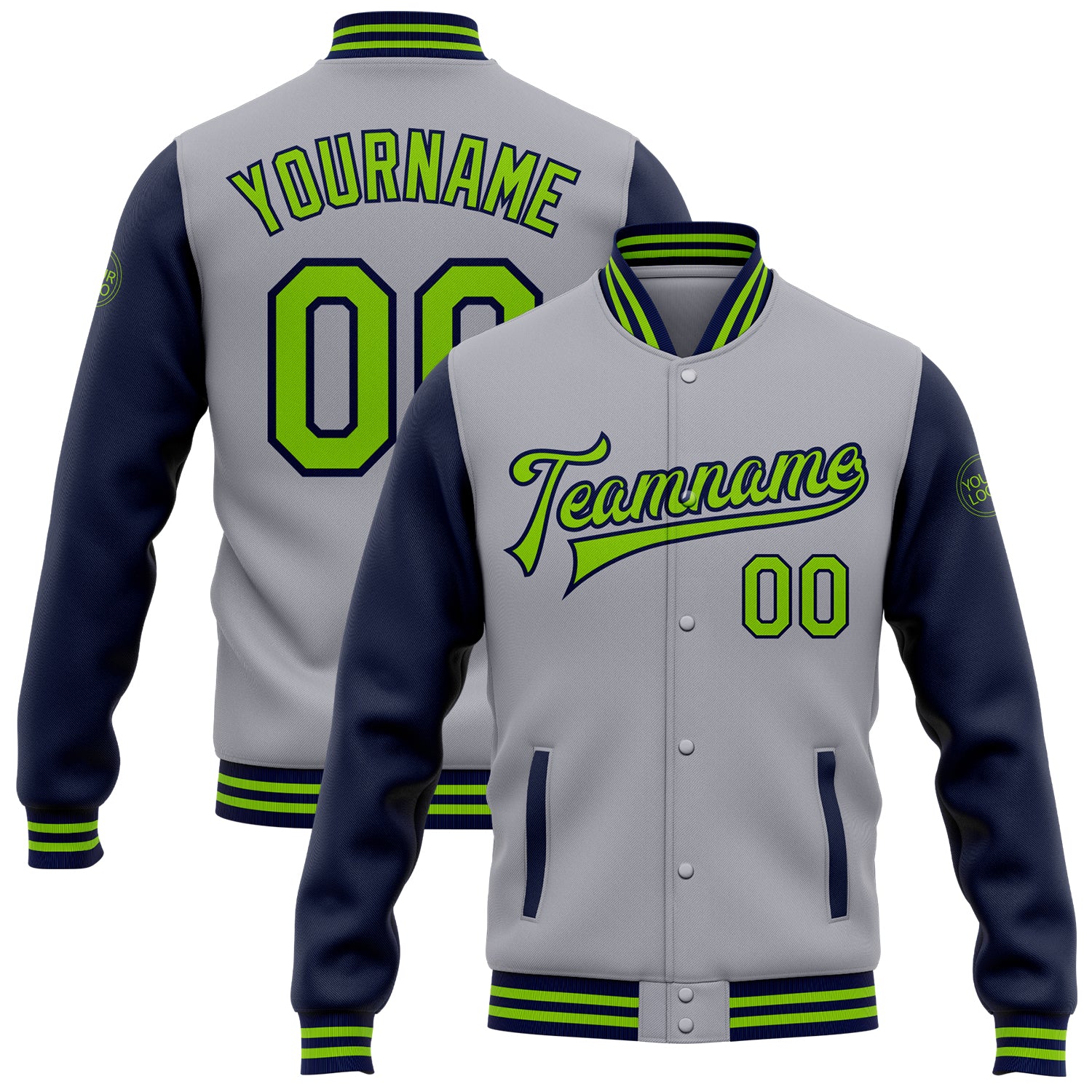 Custom Gray Neon Green-Navy Bomber Full-Snap Varsity Letterman Two Tone Jacket