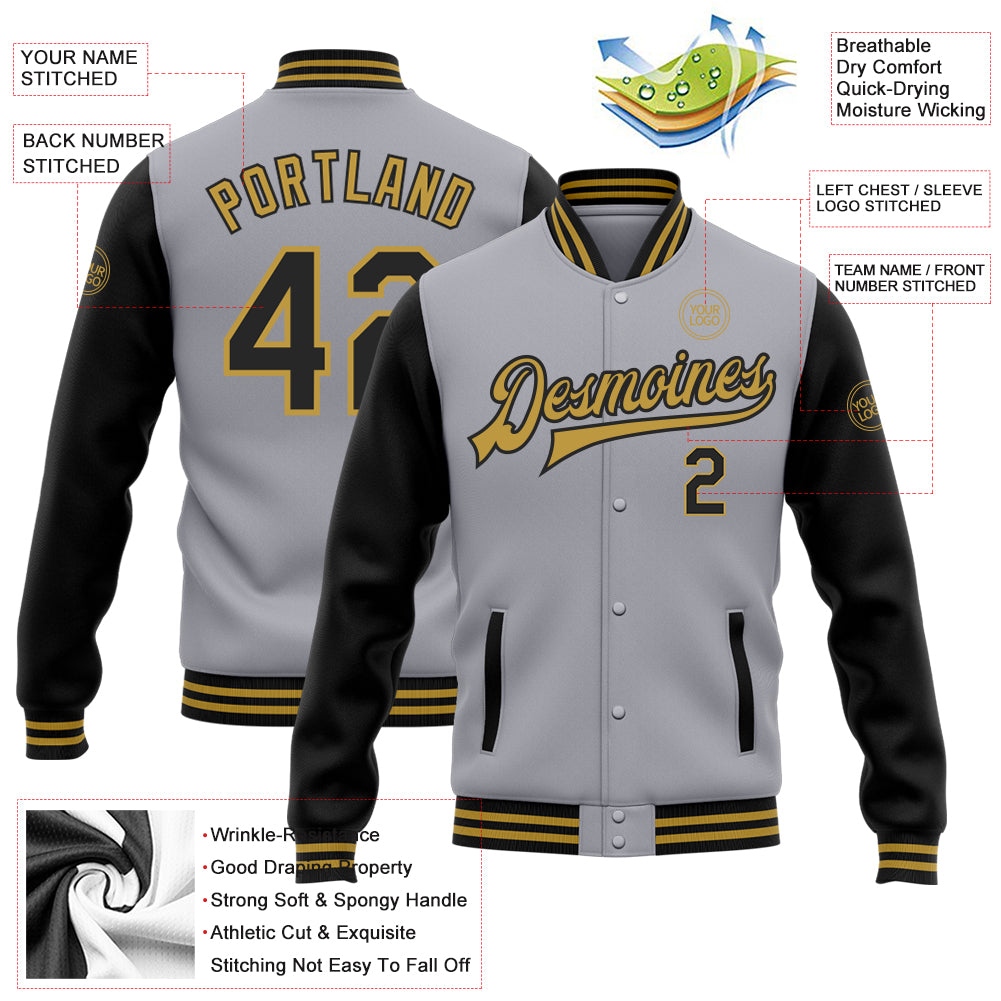 Custom Gray Black-Old Gold Bomber Full-Snap Varsity Letterman Two Tone Jacket