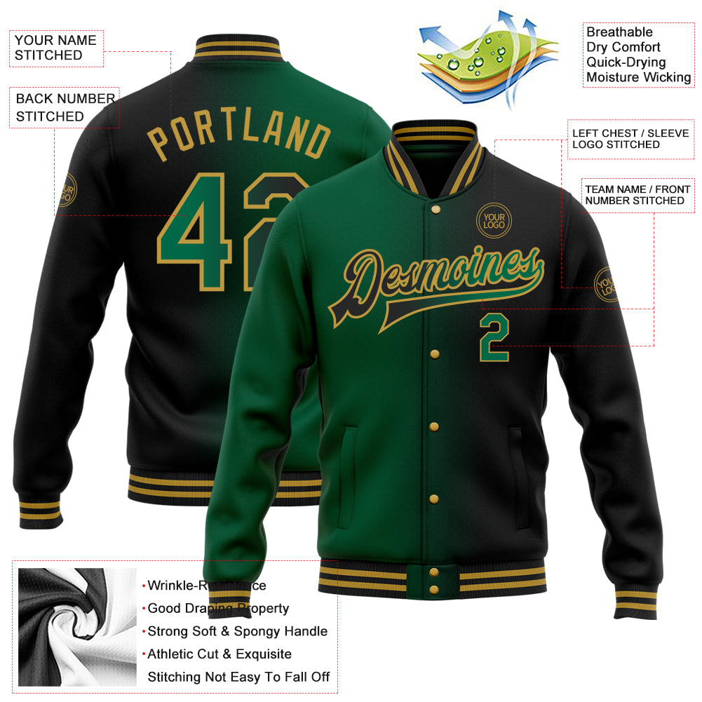 Custom Black Kelly Green-Old Gold Bomber Full-Snap Varsity Letterman Gradient Fashion Jacket