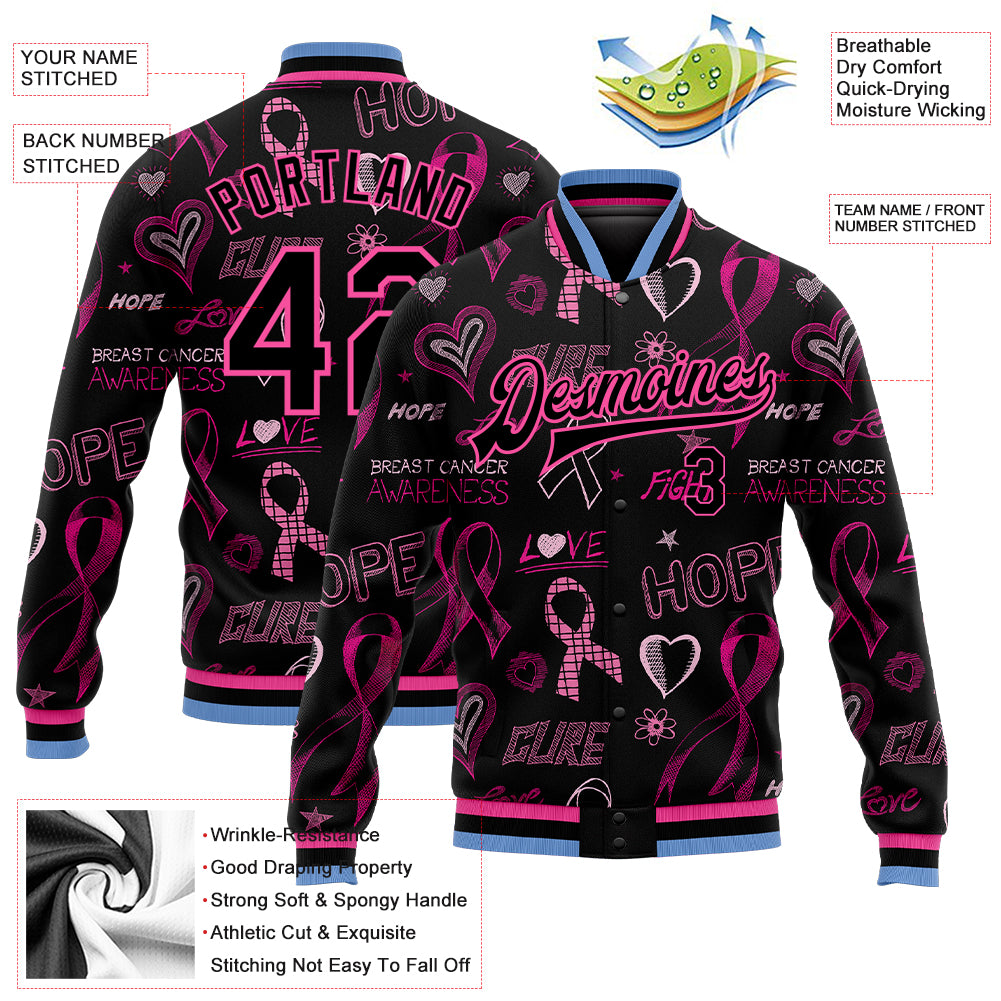 Custom Black Black Pink-Light Blue Pink Ribbon Breast Cancer Awareness 3D Pattern Design Bomber Full-Snap Varsity Letterman Jacket