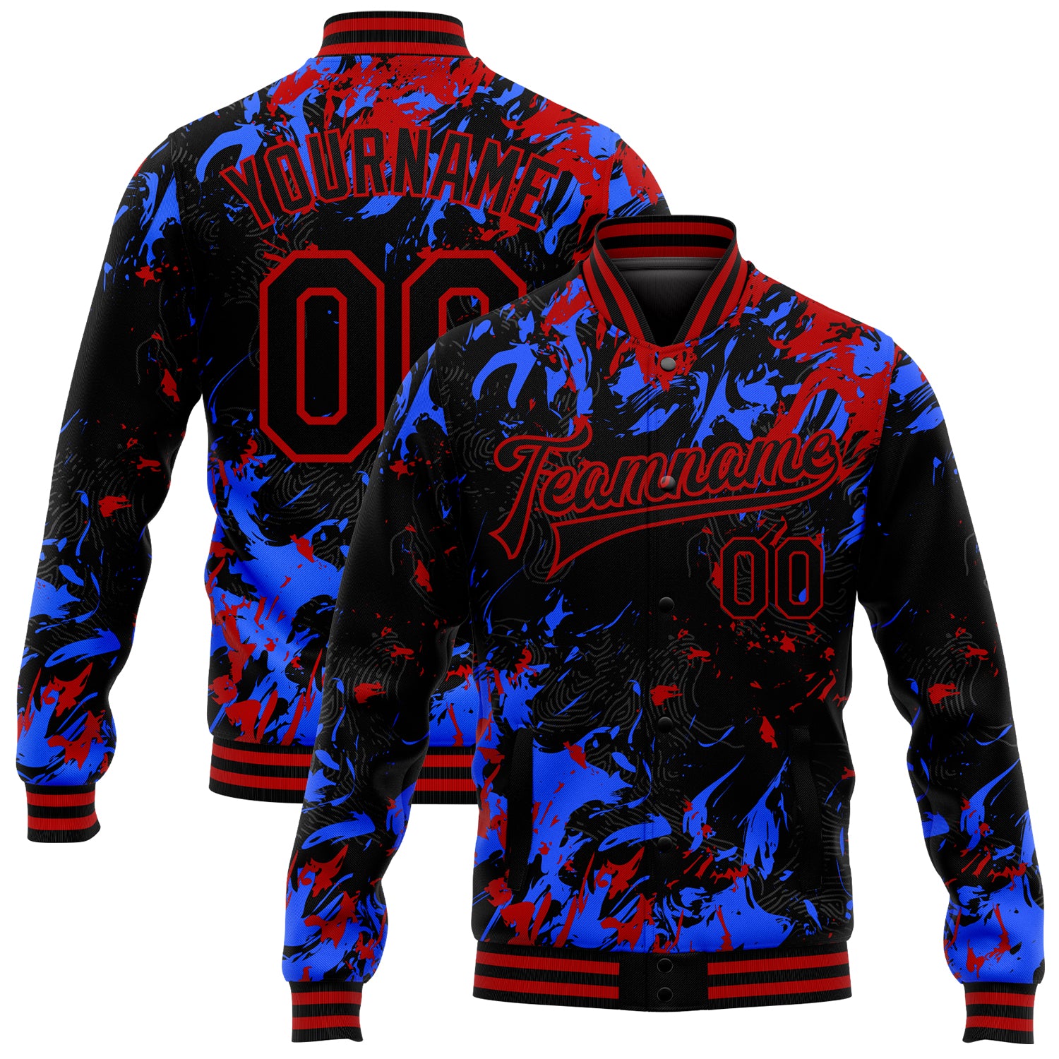 Custom Black Red-Royal 3D Pattern Design Bomber Full-Snap Varsity Letterman Jacket