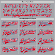 • Load image into Gallery viewer, Custom Gray Navy White-Red Bomber Full-Snap Varsity Letterman Jacket