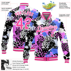 Custom Black Pink-White Leopard 3D Pattern Design Bomber Full-Snap Varsity Letterman Jacket
