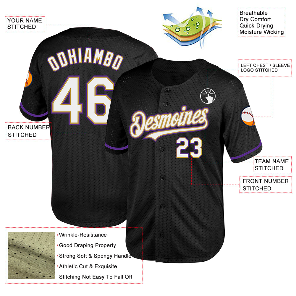Custom Black White Old Gold-Purple Mesh Authentic Throwback Baseball Jersey