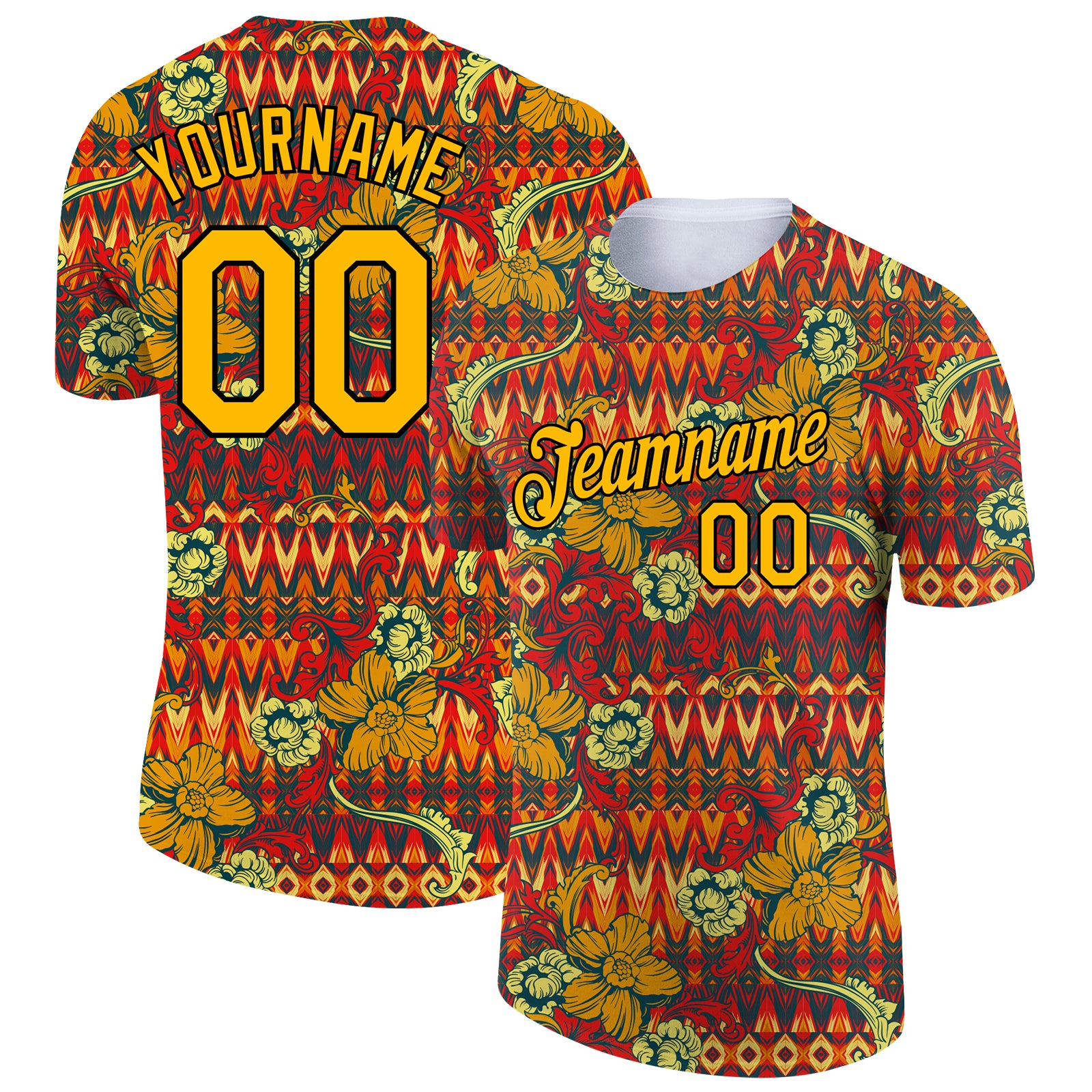 Custom Red Gold-Black 3D Pattern Floral Design Performance T-Shirt