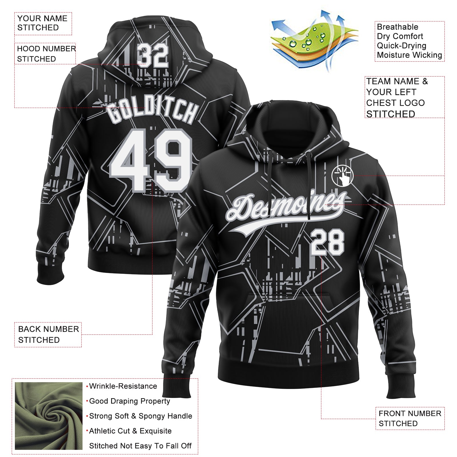 Custom Stitched Black White-Gray 3D Pattern Design Line Sportswear Pullover Sweatshirt Hoodie
