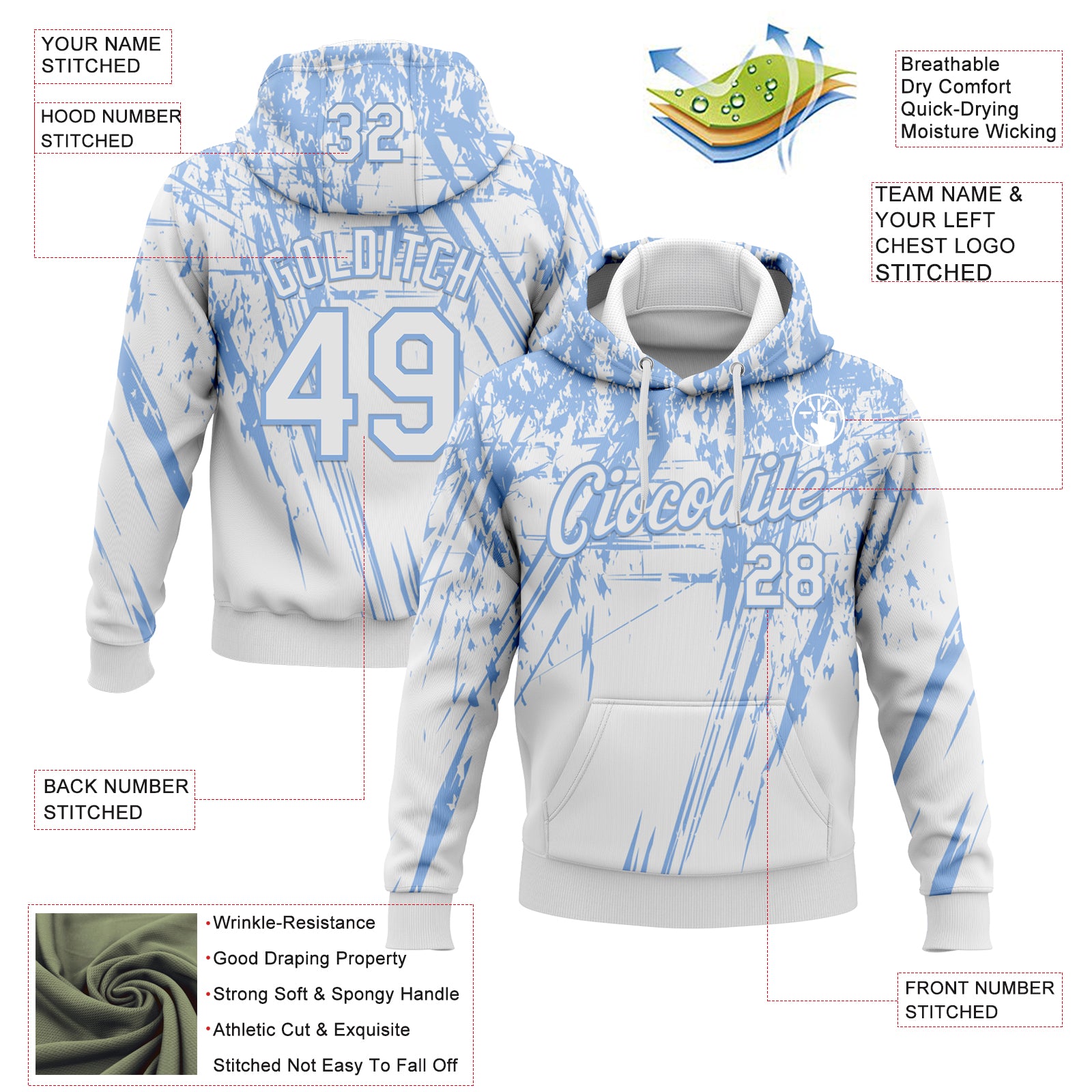 Custom Stitched White Light Blue 3D Pattern Design Splash Grunge Art Sports Pullover Sweatshirt Hoodie