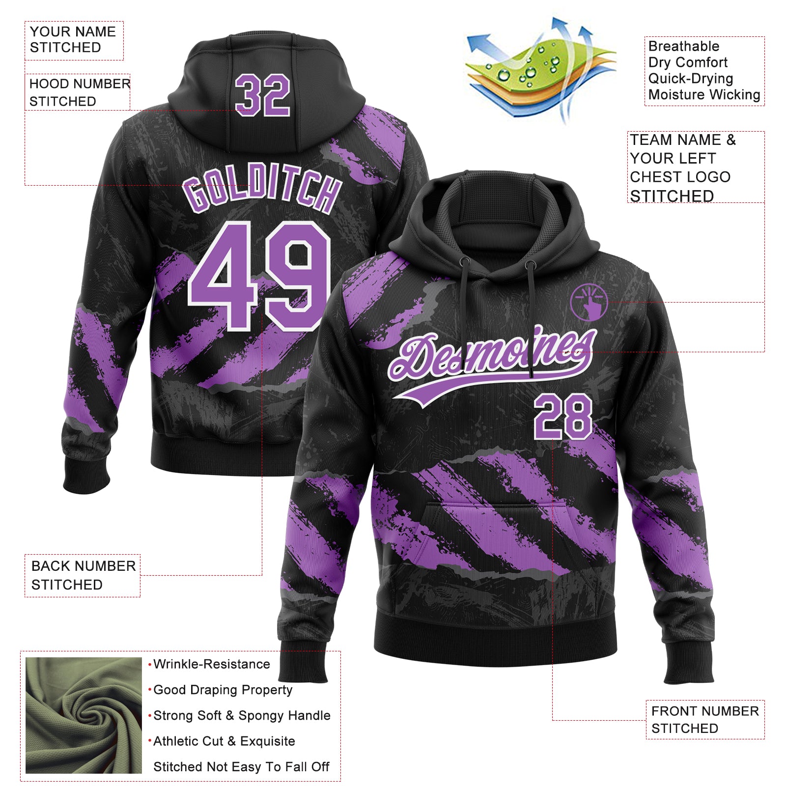 Custom Stitched Black Medium Purple Steel Gray-White 3D Pattern Design Splash Sports Pullover Sweatshirt Hoodie
