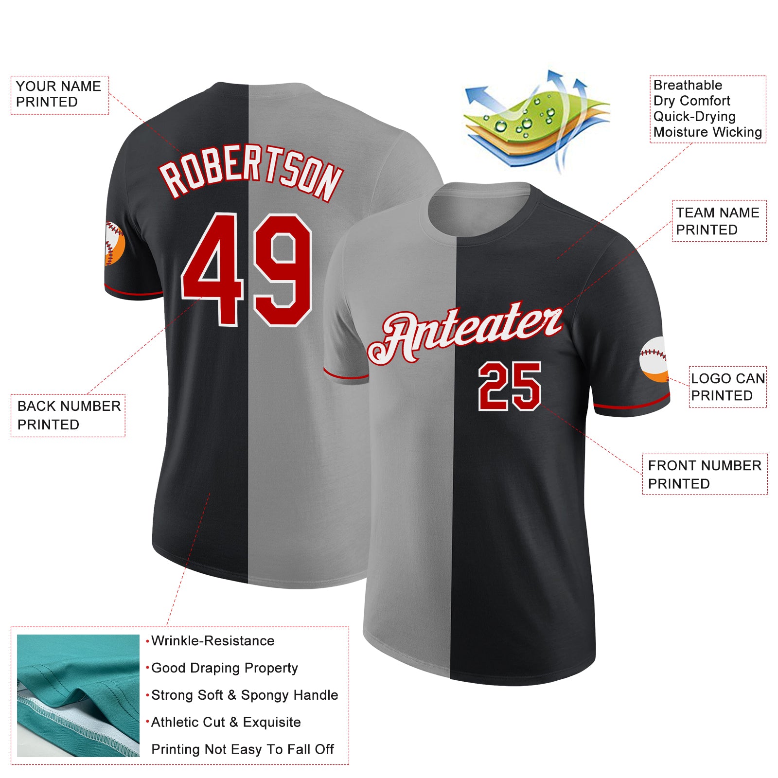 Custom Black Red-Gray Split Fashion Performance T-Shirt